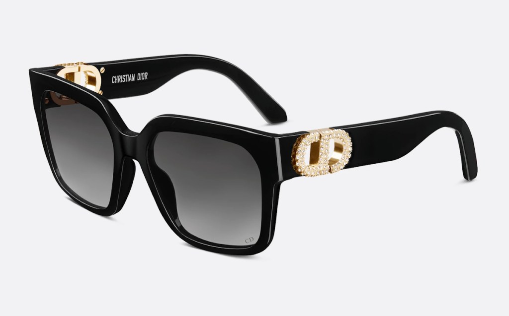 The 30Montaigne S11I sunglasses present a square shape with contemporary appeal. The black acetate frame is enhanced by a CD hinge in gold-finish metal with white Swarovski crystals. Gray gradient lenses (Priced at $860.00).