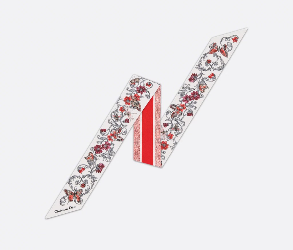 The ivory and red silk twill Mitzah scarf showcases the Cœur des Curiosités print by Pietro Ruffo, showcasing a floral design elevated by symbols like the bee, butterfly and swallow (Priced at $250.00).