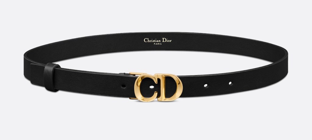 The C’est Dior belt is both a modern and elegant creation. Crafted in black smooth calfskin, its slim silhouette is embellished with a CD buckle in a shiny gold-finish metal (Priced at $660.00).
