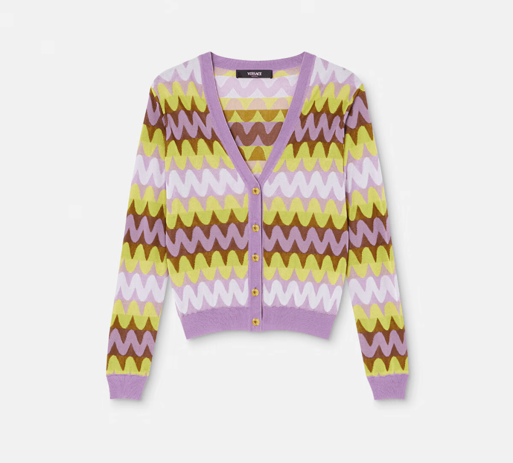 Wave pattern. Medusa hardware. Long sleeves. V-neckline. Front button closure. Ribbed trims (Priced at $1,590.00).
