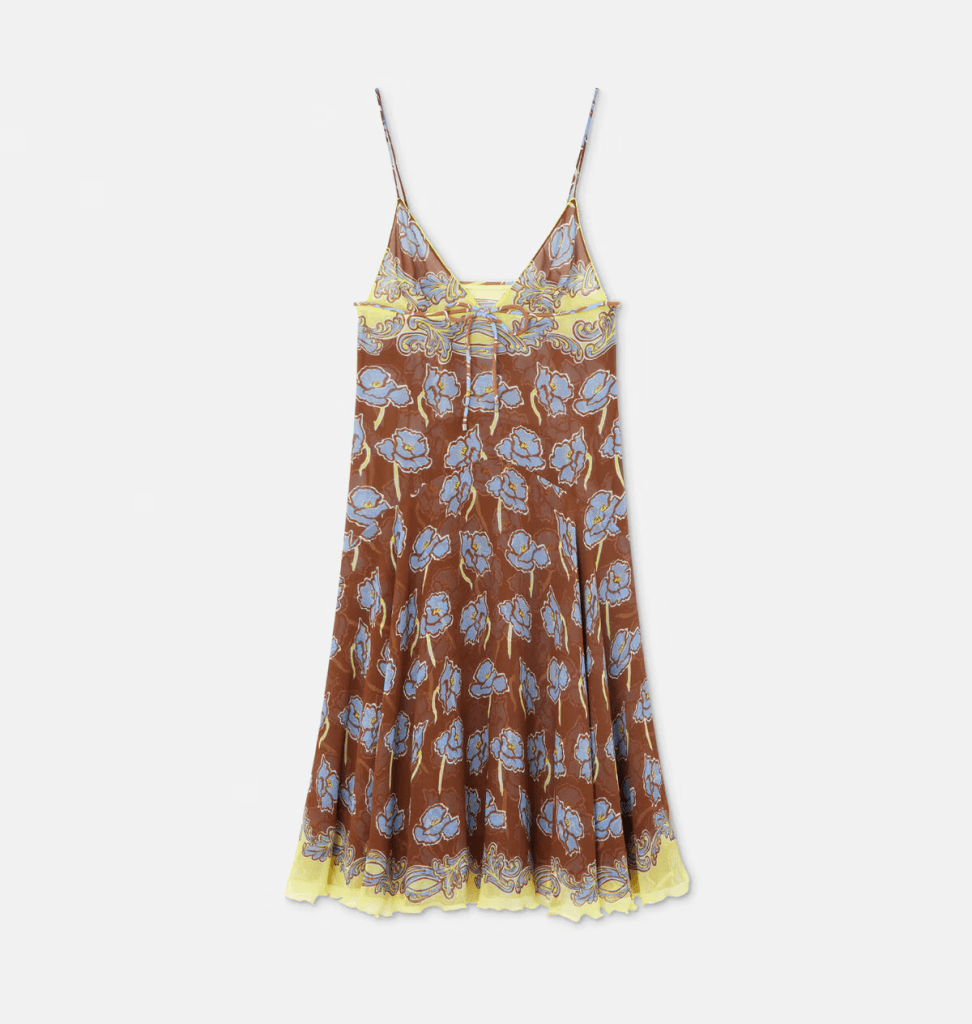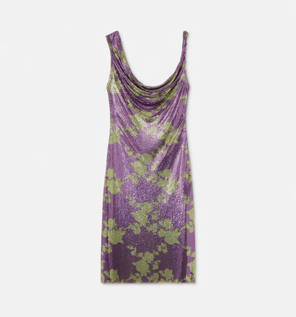 From a pair of satin heels with the Versace Bright Crystal fragrance bottle on the heel to a camisole midi dress crafted from a semi-sheer silk georgette featuring an all-over Poppies Foulard print – scroll further for theFashionSpot’s top picks from the Versace Spring 2025 collection:
