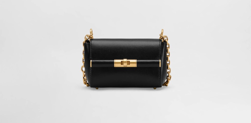 Small Sicily bag in polished calfskin. Black. Front flap. Logo tag featuring two metal plating finishes. Top handle and adjustable, detachable strap. Printed fabric lining and flat pocket (Priced at $1,695.00).