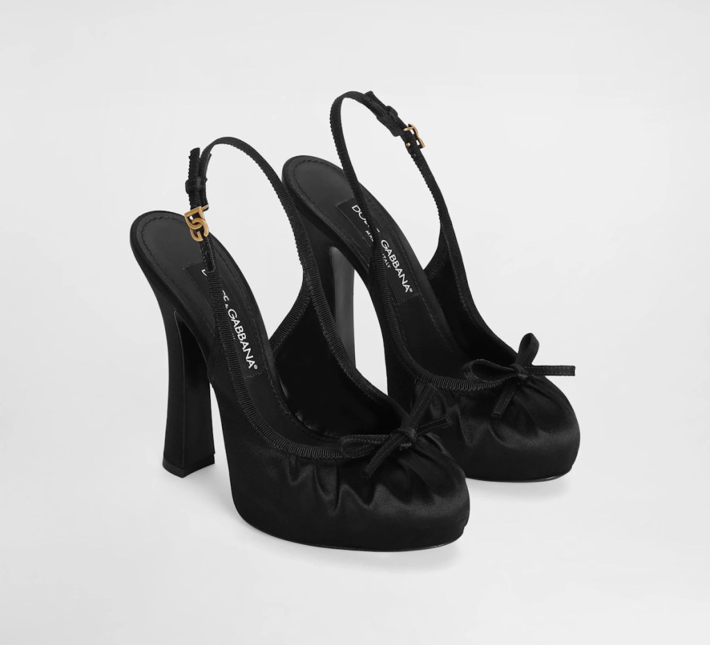 Satin platform slingbacks with bow detail. Black. 105-mm platform. Adjustable gros-grain strap with DG logo. Kidskin insole with branded label. Branded leather sole (Priced at $1,095.00).