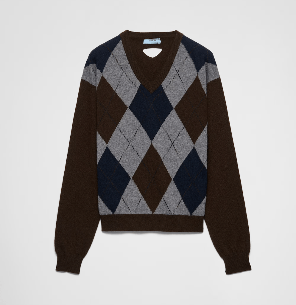 Long sleeves. Jacquard knit. Menswear fit. V-neck, Raglan shoulder, Ribbed knit cuffs and hem (Priced at $2,200.00).
