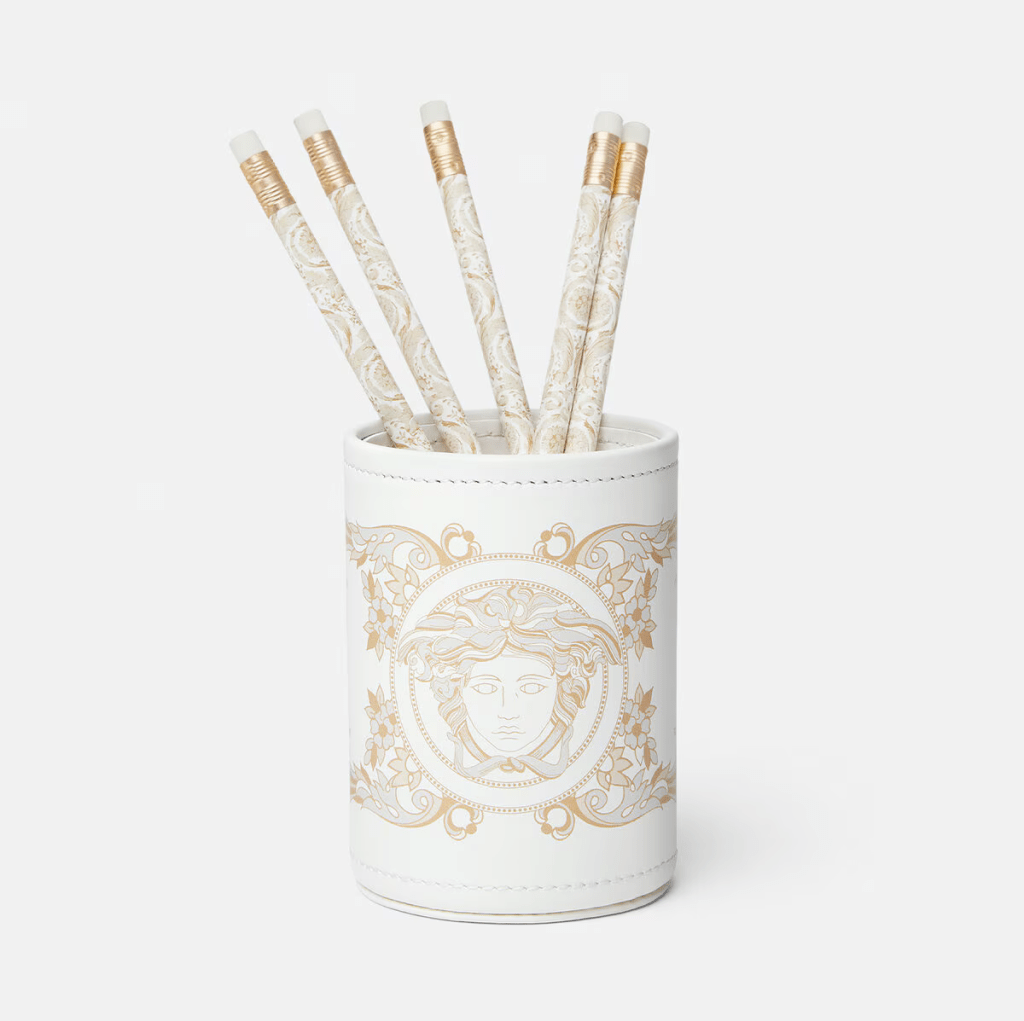 A smooth leather pencil holder featuring the Medusa Gala print including a set of 6 matching wooden pencils (Priced at $325.00).