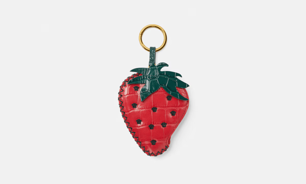 A joyful accessory to complement everyday bags, this croc-effect leather keychain has a strawberry shape and features small three-dimensional Medusa hardware and a zipped internal compartment (Priced at $550.00).