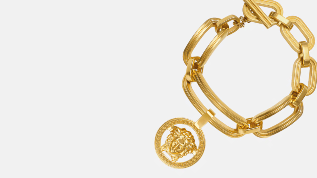 Crafted with an open, handmade design. Adorned with a sliding signature Medusa ’95 pendant, offering versatile wearability on both wrists. All Versace jewelry products are lead and nickel-free (Priced at $995.00).