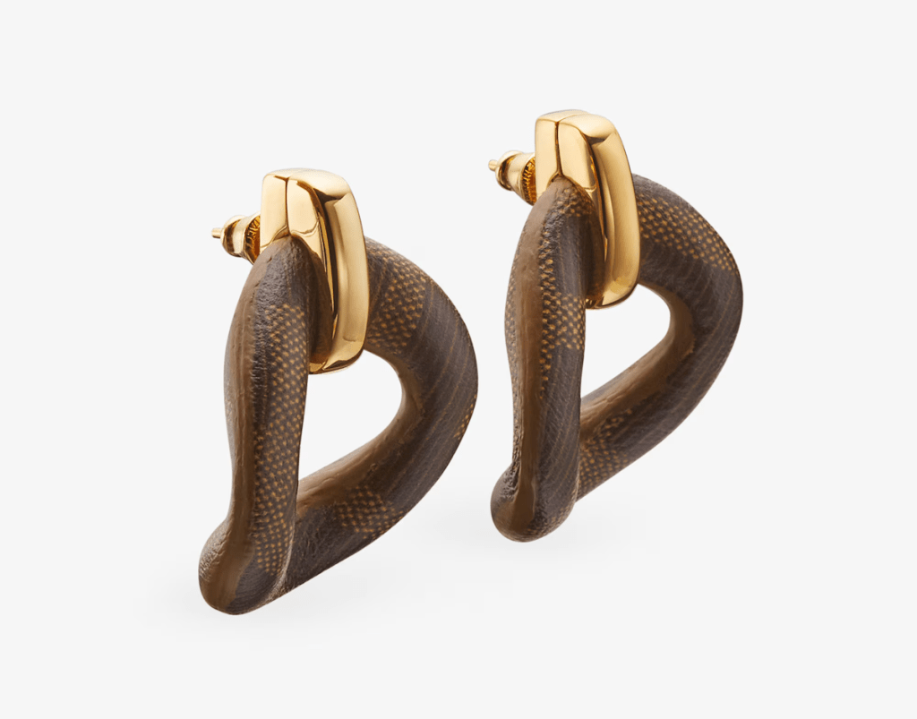 Small stud earrings made of metal with a gold finish. Irregular circle pendant in nappa leather printed with brown trompe-l’oeil effect FF motif ($690.00).
