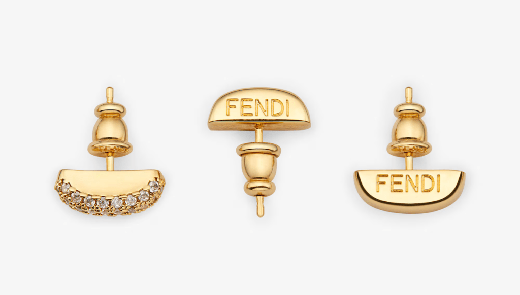 Set of three metal stitching-effect stud earrings, made of gold-finish metal. Two are decorated with the Fendi logo and one with white crystals ($450.00).