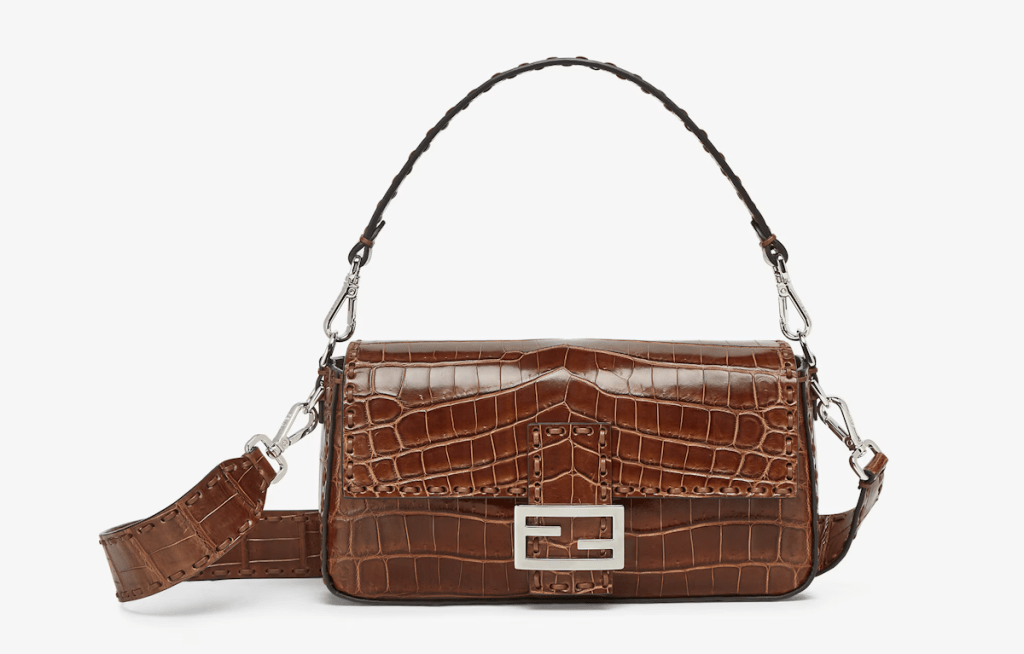 Medium iconic Baguette bag made with 612 hand-sewn macro topstitches. Made of exquisite brown crocodile leather embellished with an FF clasp. Featuring a front flap, magnetic clasp, nappa leather-lined internal compartment with a zipper pocket. Selleria logo plate in silver, palladium-finish metalware. The bag can be carried by hand, or worn either on the shoulder or cross-body thanks to the crocodile leather handle and shoulder strap, both detachable ($24,000.00).