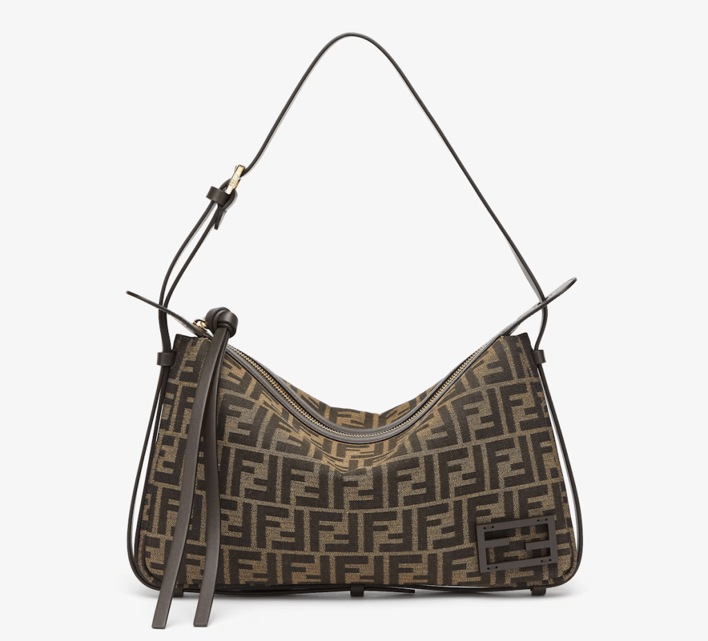 Medium Simply Fendi bag, a soft shoulder bag presented at the Fall-Winter 2024/25 fashion show, named after its elegant and essential design inspired by a 1990s archive style. Made of jacquard fabric with iconic brown FF motif. Decorated with the iconic FF embellishment in dark brown patent leather. Closed by a long, dark brown calfskin zipper-pull with knot and featuring an internal lined compartment with a zipper pocket and gold-finish metalware. Can be worn on the shoulder or cross-body thanks to the adjustable shoulder strap ($2,850.00).