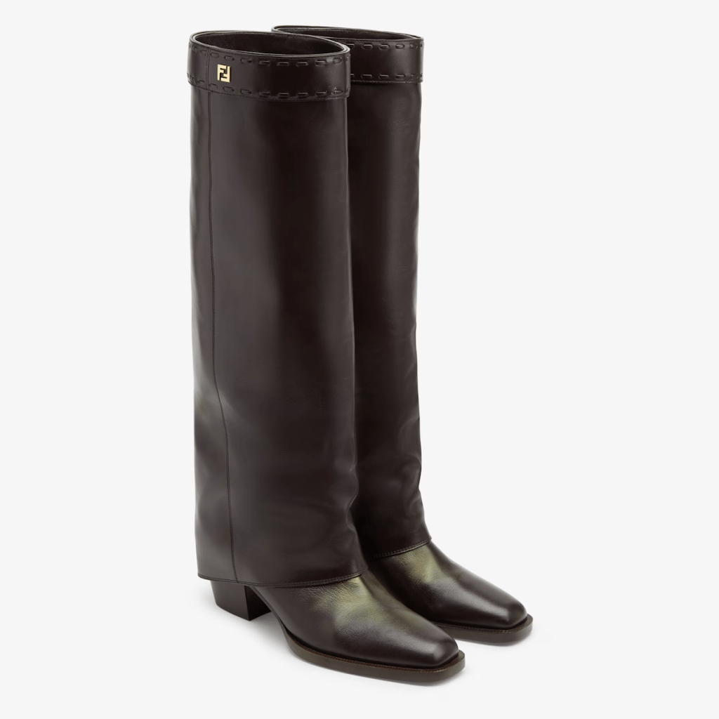 Thigh-high boots with square toe and tubular leg. Handmade in shiny, green leather. The leg partially covers the heel creating a trompe l’oeil effect and soft creases on the front. FF strap at the knee, finished with hand-sewn tone-on-tone macro Selleria topstitches ($3,100.00).