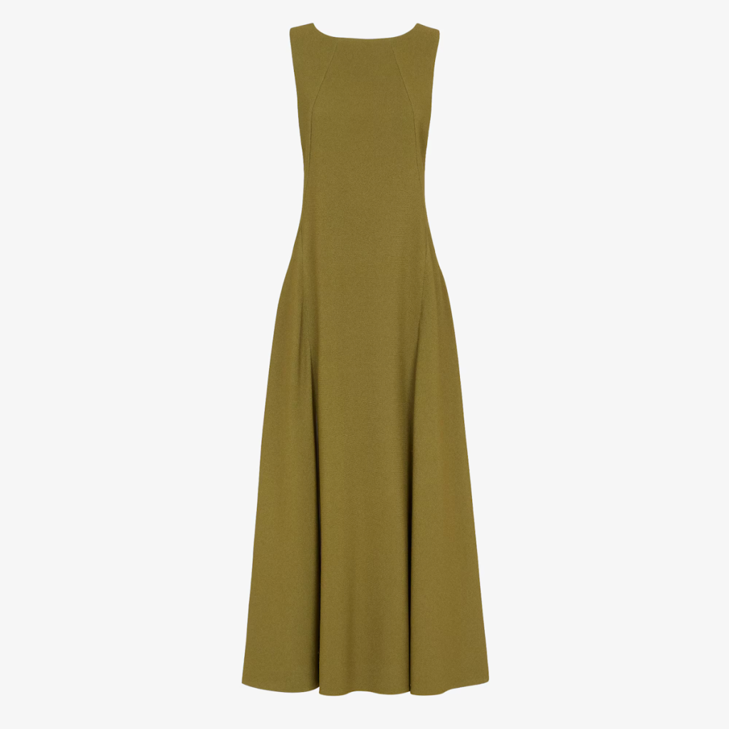 Long sleeveless dress with halter neckline on the back and V detail. Fluid Flowing silhouette fitted at the waist and with a full skirt. Rear matching-tone zipper closure. Lined. Made of olive green sablé fabric ($3,100.00).