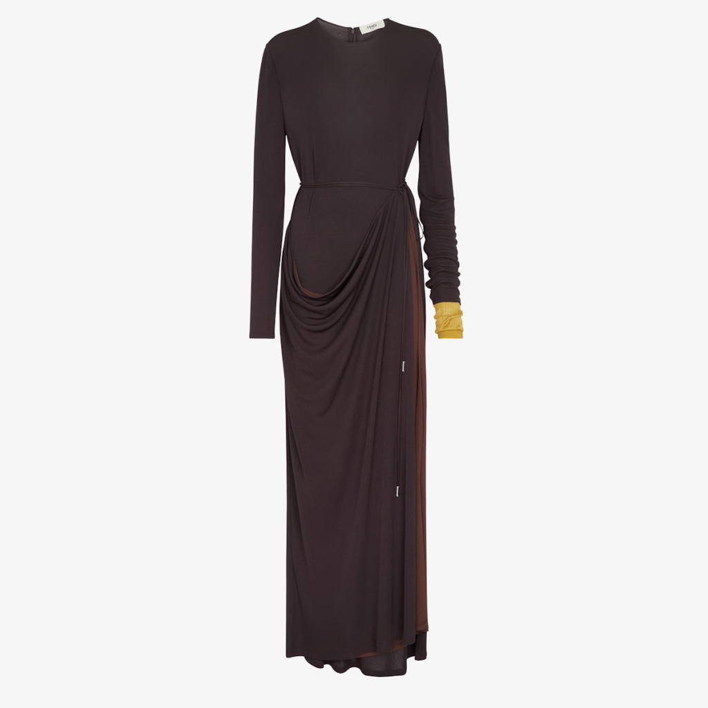 From a slim-fit long draped dress in dark purple jersey and a statement pair of burgundy leather high-heeled boots to the must-have Simply Fendi handbag and a slightly flared green leather overcoat – shop theFashionSpot’s top picks from the Fall 2024 Fendi collection: