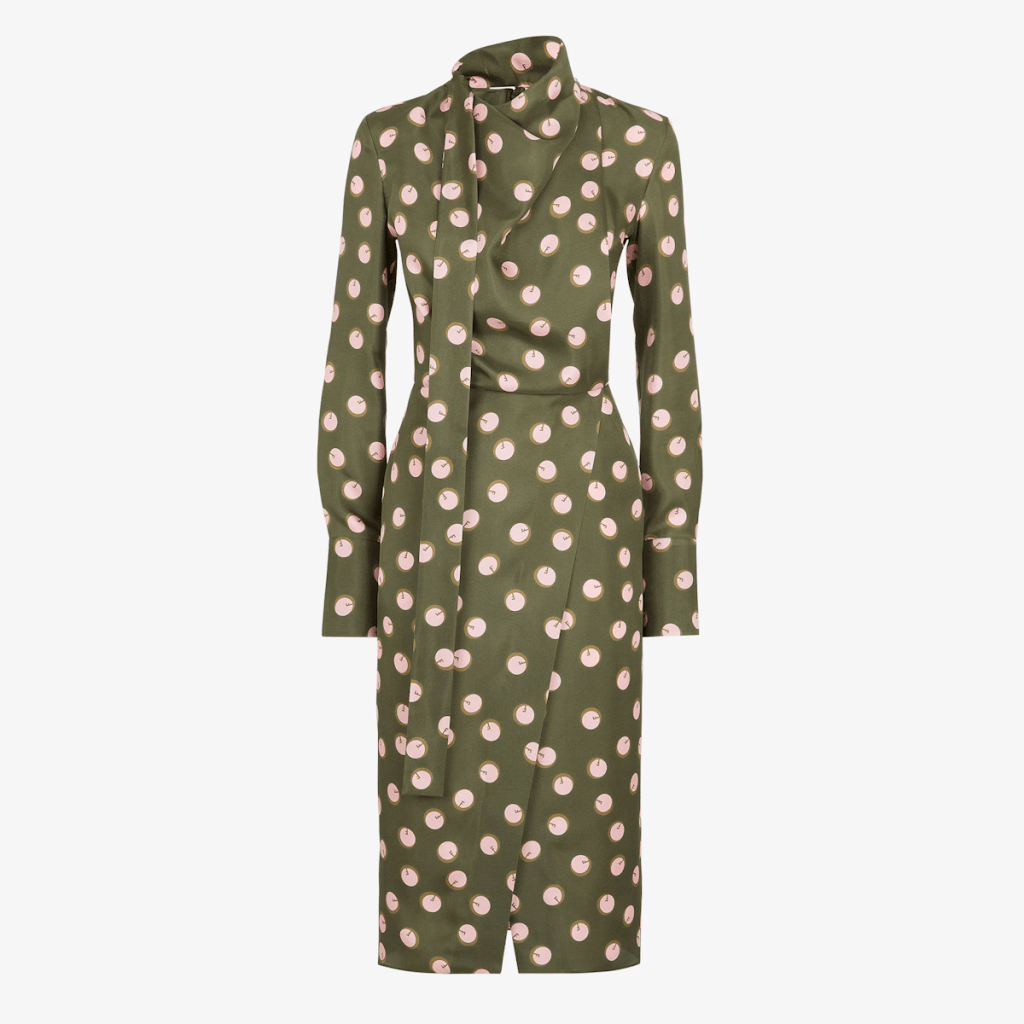 Long-sleeved midi dress with high collar and scarf detail to tie at the side. The silhouette is fitted at the waist, with diagonal seam on the front and small central slit at the hem. Back zipper closure. Made of silk twill with a dark green and pink all-over polka-dot Fendi motif print ($3,490.00).