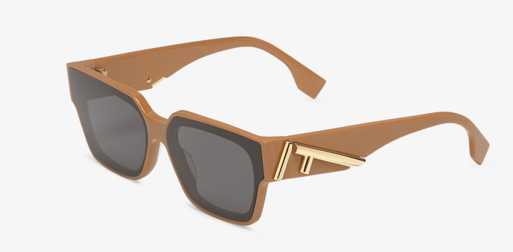 Rectangular Fendi First eyeglasses in beige acetate. Temples with oversize diagonal F motif in gold-colored metal. Smoke-gray lenses ($450.00).