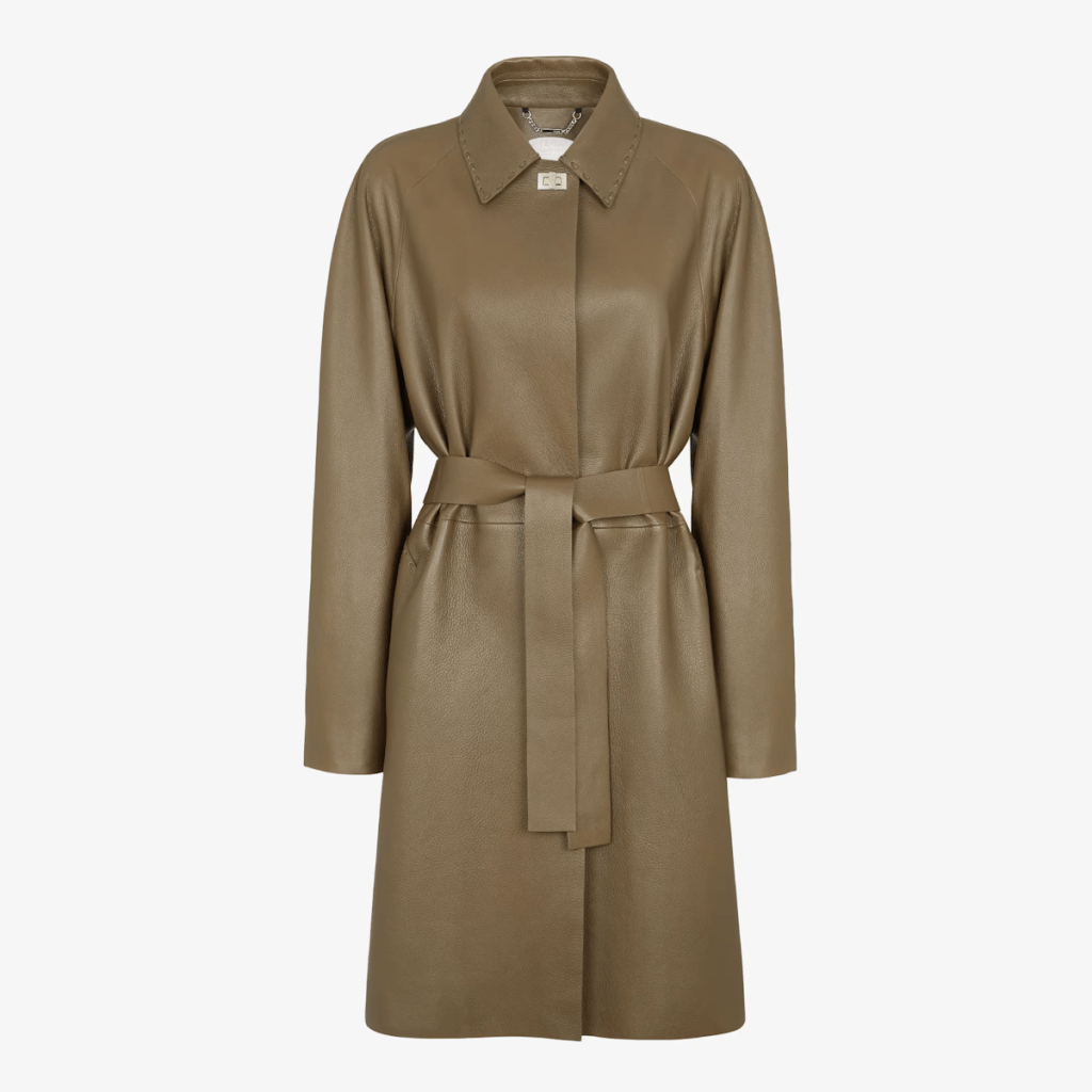 Slightly flared overcoat. Shirt collar, raglan sleeves and side welt pockets. Center slit at the back. Lined. Made of soft, dark green hammered leather. Finished with hand-sewn tone-on-tone macro Selleria topstitches. Closure with Peekaboo metal twist lock detail and matching belt ($9,500.00).