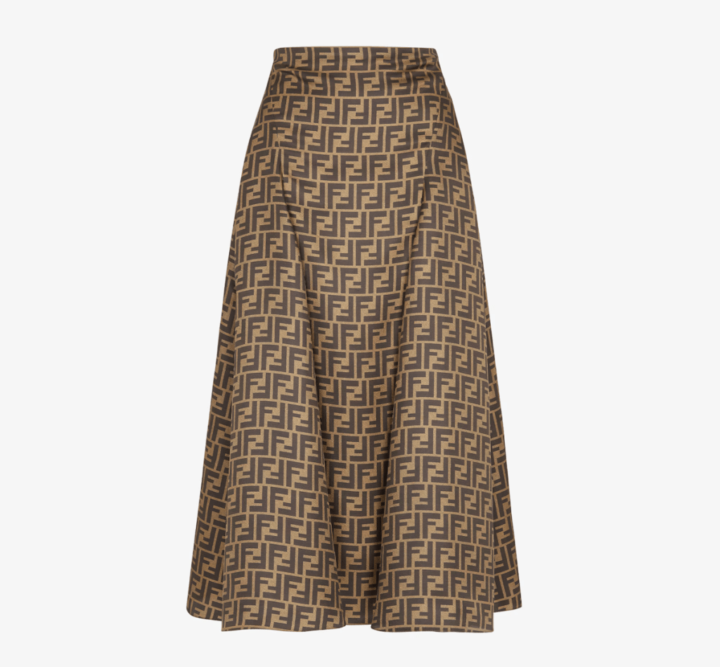 High-waisted skirt with a flowing, flared line. Back zipper closure. Made of silk twill with the iconic FF motif printed all over in brown ($1,850.00).