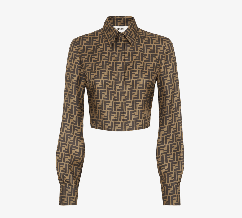 Crop top with shirt collar and long sleeves. Concealed front closure. Made of silk twill with the iconic FF motif printed all over in brown ($1,550.00).