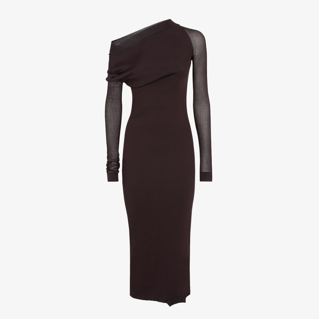 Close-fitting midi dress. Asymmetric neckline and long sleeves. Made of dark purple extra-fine yarn with ribbing. Finished with see-through sleeves and a rib-knit neckline that wraps over on the shoulder ($2,390.00).