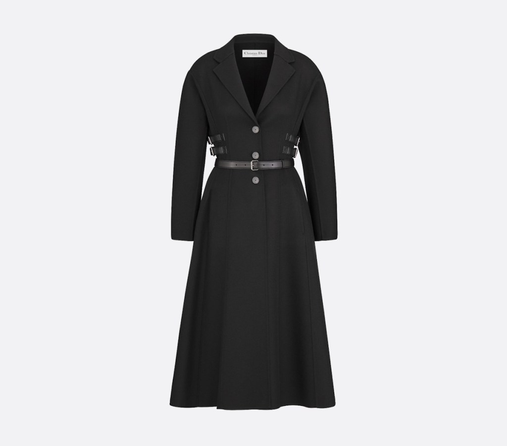 Removable black leather belt with Christian Dior metal buckle. Double-breasted with four buttons. Christian Dior Paris horn buttons. Asymmetric style. Tonal lining (Priced at $4,300.00).